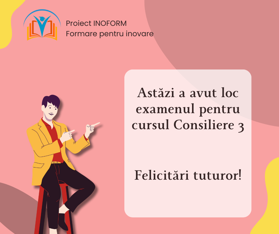 29 ianuarie 20262 februarie 2026consiliere in cariera, Examen 📘 INOFORM – Examen Consiliere 3 Astăzi a avut loc examenul pentru cursul Consiliere 3, desfășurat în cadrul proiectului INOFORM – Formare pentru inovare. Această etapă a marcat […] Citește mai mult